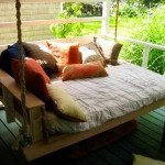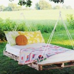 S'il y a un endroit approprié dans le jardin ou sur la terrasse, vous pouvez y installer un lit suspendu confortable. Sa base est constituée de deux palettes standard, soigneusement fixées l'une à l'autre. Pour une fixation fiable du matelas, vous pouvez construire une boîte spéciale et utiliser pour cela la troisième palette restante inutilisée. La profondeur correspondra à l'épaisseur du matelas.Si vous le souhaitez, les planches et barres restantes peuvent être utilisées pour tête de lit installations. Pour soutenir la verrière d'un tel lit, ainsi que des personnes qui s'y reposent, vous aurez besoin de chaînes ou de cordes solides et d'un support fiable.