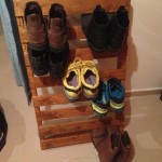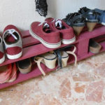 Des palettes peuvent se révéler simples étagère à chaussures pour donner. Il suffit de couper une palette en deux parties, de les installer les unes sur les autres et de les fixer solidement: dans la zone que l'étagère occupera, vous pouvez placer trois fois plus de chaussures qu'auparavant, et si vous prenez le temps de décorer une telle chaussure, elle deviendra une décoration pour le chalet maison.