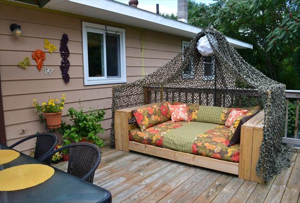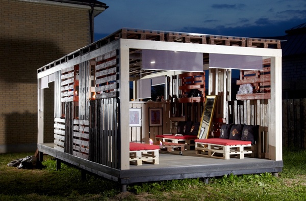 Ceux qui suivent le temps et utilisent le chalet non seulement pour cultiver des légumes et des fruits, savent que vous pouvez organiser vos vacances à la campagne à l'aide d'un projecteur, de plusieurs bons films et d'un groupe d'amis. Vous pouvez organiser un endroit confortable pour regarder un film à l'aide de palettes. Pour créer un lit à trois niveaux, vous aurez besoin de 12 palettes: la base est renversée et 6 palettes, et la hauteur du premier niveau sera égale à la hauteur d'une palette. Pour équiper le deuxième étage, à la partie centrale de la base, fixer sur une palette. Le troisième étage nécessitera la fixation séquentielle de deux autres couches de palettes. Il reste à peindre le design et à décorer avec des oreillers. Au fait, une solution similaire utile pour organiser un home cinéma dans une pièce.