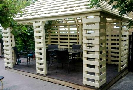 Vous pouvez fermer tous les murs du gazebo avec des palettes, ou vous ne pouvez les faire que jusqu'à une certaine hauteur - dans tous les cas, l'espace à l'intérieur sera rempli de lumière et bien ventilé. Gazebo sur le toit mieux fait de polycarbonate, parmi les alternatives - tuile flexible, onduline et tuile en métal.