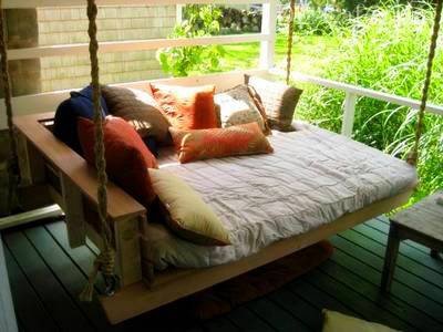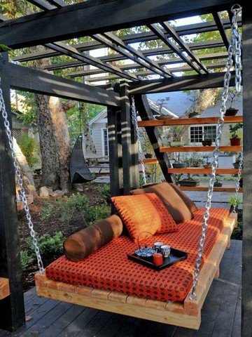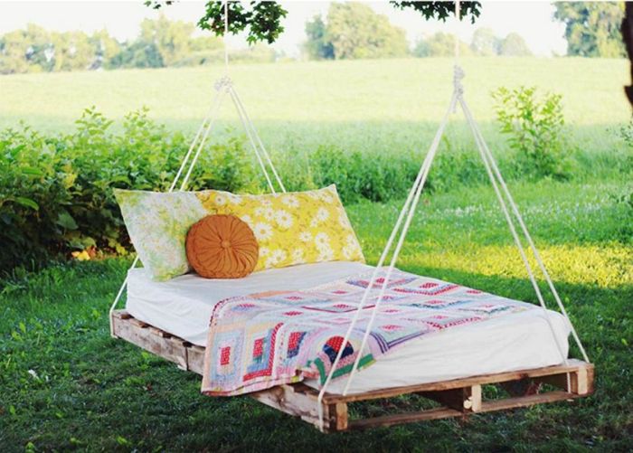 S'il y a un endroit approprié dans le jardin ou sur la terrasse, vous pouvez y installer un lit suspendu confortable. Sa base est constituée de deux palettes standard, soigneusement fixées l'une à l'autre. Pour une fixation fiable du matelas, vous pouvez construire une boîte spéciale et utiliser pour cela la troisième palette restante inutilisée. La profondeur correspondra à l'épaisseur du matelas.Si vous le souhaitez, les planches et barres restantes peuvent être utilisées pour tête de lit installations. Pour soutenir la verrière d'un tel lit, ainsi que des personnes qui s'y reposent, vous aurez besoin de chaînes ou de cordes solides et d'un support fiable.