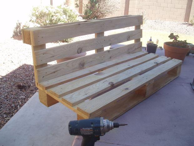 En plus d'une table de palettes en bois, vous pouvez rendre confortable canapésfauteuils et bancs. Un banc est construit de cette façon: