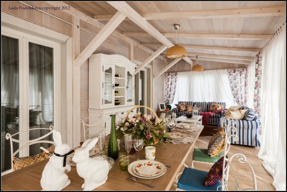 En faisant l'intérieur d'une maison de campagne, n'oubliez pas la véranda, qui accueille les invités. Ici, vous pouvez mettre une table avec des chaises ou des canapés, la transformant en un lieu de repos confortable ou même une tonnelle pleine.