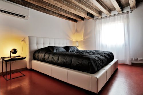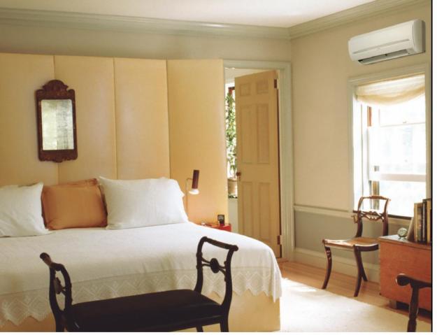 Endroit optimal pour la climatisation dans la chambre - un mur à la tête du lit, mais l'appareil n'est pas accroché directement au-dessus du lit, mais sur le côté du lit. Dans ce cas, l'air froid se concentrera plus près des pieds des vacanciers et non près de la tête.