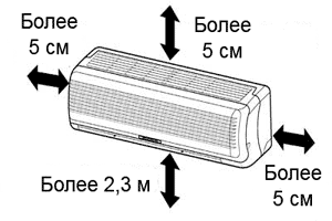 - distance optimale entre le plafond et la limite supérieure de l'unité intérieure du système divisé - 10-15 cm. L'apport d'air chaud de l'appartement est effectué par la partie supérieure, il est donc si important qu'il y ait suffisamment d'espace pour une circulation sans entrave des masses d'air;