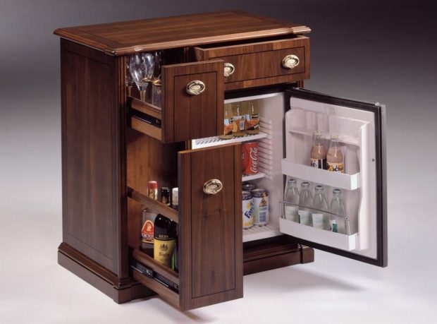 Les minibars autoportants sont souvent réalisés dans un design intéressant et exclusif. Il peut ressembler à un petit bois commode avec plusieurs tiroirs et tiroirs pivotants - une excellente option pour un bureau ou un salon dans un style classique. Il y a des armoires qui ressemblent à un coffre-fort ou même à un micro-ondes - une option pour un intérieur de style salut-technologie et minimalisme. Lorsque vous choisissez un minibar, il vaut la peine de réfléchir très attentivement à sa l'intérieur.