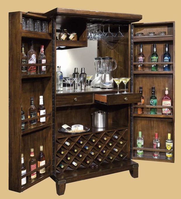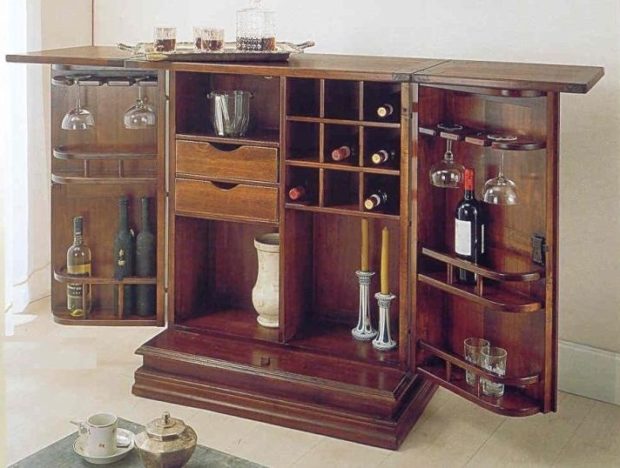 Il peut encore y avoir de nombreuses options, mais tous les minibars peuvent être conditionnellement divisés en ouvertquand toute la collection est en vue fermé et portablequi peut être facilement déplacé si nécessaire. Si vous n'avez pas l'argent pour acheter un minibar séparé, vous pouvez organiser un espace de stockage sur les étagères de la cuisine ou dans les armoires.