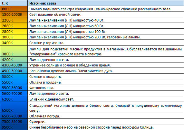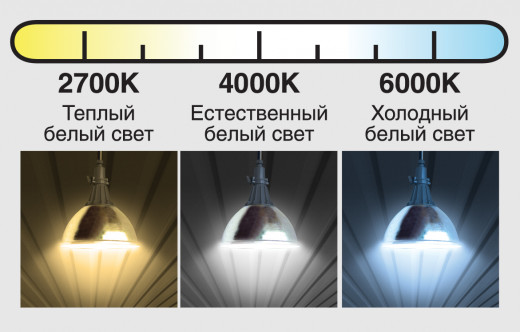 Une lampe avec la même puissance peut produire une lumière d'une nuance différente, plus chaude ou plus froide. La température de couleur est mesurée en kelvins et doit être indiquée sur l'emballage de la lampe. En vente, vous pouvez trouver des lampes avec température de 2700 K à 6500 K: plus l'indicateur est bas, plus la lumière sera chaude et jaune.