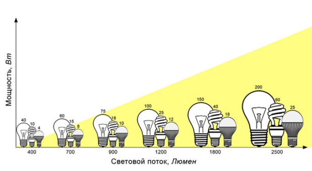 La dépendance du flux lumineux sur la puissance permet de juger de l'efficacité de la lampe et de son rendement lumineux, qui est mesurée en lm / W. Les ampoules à incandescence pour chaque 1 W d'électricité consommée ne donnent que 10-16 lm de plafond lumineux, soit avoir un rendement lumineux de 10-16 lm / W. Les lampes halogènes ont un rendement lumineux de 15-22 lm / W, fluorescent - 40-80 lm / W, LED - 60-90 lm / W.