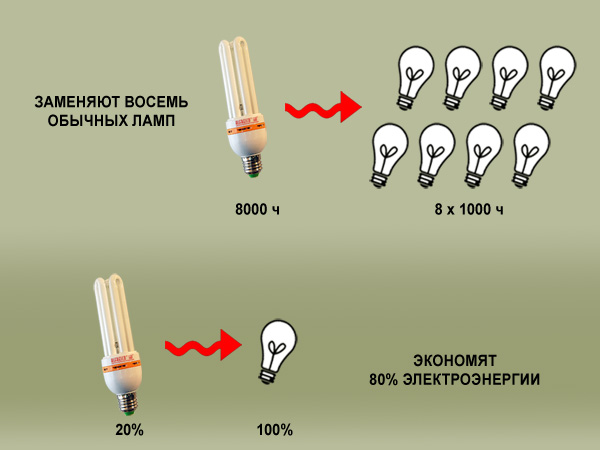 - rendement lumineux élevé par rapport aux lampes à incandescence. De CFL avec une puissance de 20 W, vous pouvez obtenir autant de lumière que d'une "lampe Illich" d'une puissance de 100 W;