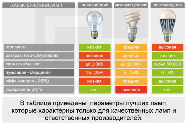 - longue durée de vie, de 20 000 à 50 000 heures ou plus. Si vous allumez une telle lampe tous les jours pendant 6 heures, nous obtenons environ 9 ans de service (c'est si vous prenez une lampe avec une ressource de 20 mille heures);