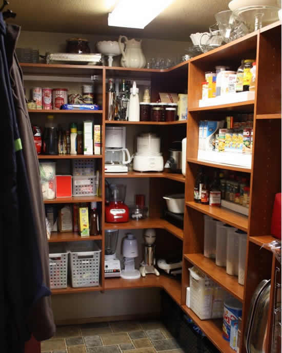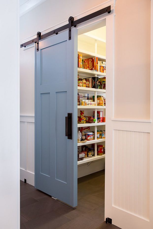 - toute la largeur du garde-manger à son extrémité - C'est une option pour les plus petits garde-manger, disposés dans une niche assez étroite. Lorsque vous ouvrez les portes, des étagères avec leur contenu apparaissent immédiatement devant vous. La profondeur des étagères peut être presque la même que la largeur du garde-manger;