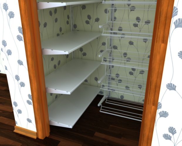 - Disposition en L étagères adaptées aux propriétaires de placards plus spacieux. Une telle disposition implique la possibilité d'entrer dans l'arrière-salle. La largeur des étagères est choisie en fonction des paramètres du garde-manger;