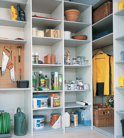 Notez que généralement le garde-manger joue un rôle stockage universel: tout est rajouté ici, du fer aux skis, mais si nécessaire, alors l'espace de stockage peut être aménagé complètement différent:
