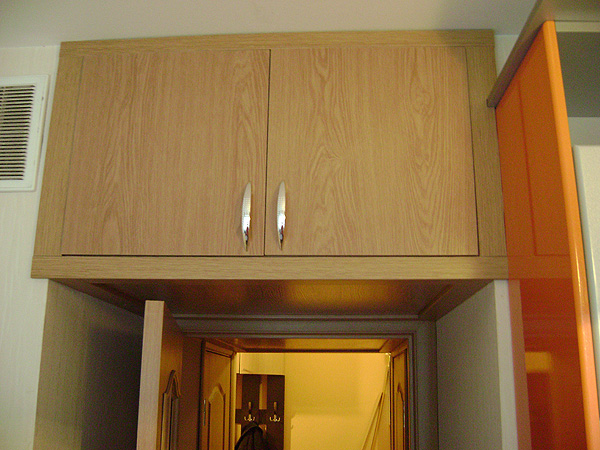 - espace au-dessus de la porte peut être utilisé pour organiser un mini-garde-manger, qui ressemblera plus à une mezzanine. L'espace de stockage sera minimal, l'accès y sera compliqué et la hauteur d'une partie de la pièce devra être sacrifiée, mais s'il n'y a pas d'autre issue, cette option fera l'affaire. Battre un niveau légèrement inférieur du plafond peut être des spots intégrés ou bande menée;