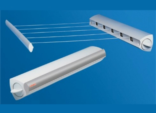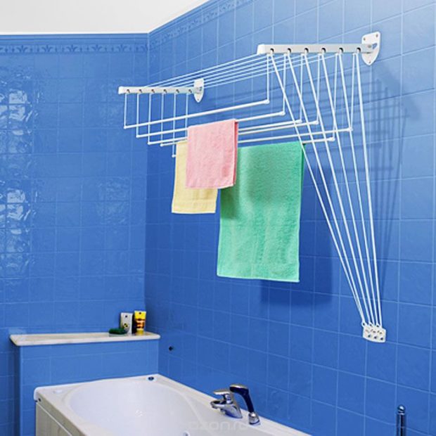 L'option la plus simple et la plus traditionnelle est séchoir mural fixe pour le lin. Si l'appartement a une place, deux lattes sont fixées aux murs entre lesquelles les cordes sont tirées. Auparavant, de telles conceptions ornaient toute la salle de bain, ce qui rend difficile pour les ménages de se déplacer, donc aujourd'hui, ces séchoirs sont principalement utilisés sur les balcons et au-delà des balcons. Option améliorée - Sécheuse à rouleau, ce qui facilite le processus de suspension des objets si l'accès à toute la longueur de la corde est compliqué. Tirez simplement sur la corde, et grâce aux rouleaux dans les lattes, elle se déplacera facilement de l'endroit et une autre partie se déplacera vers vous. Idéal pour ceux qui organisent le séchage des vêtements à l'extérieur de la fenêtre ou du balcon.
