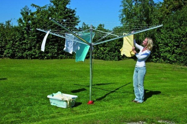 Pour la rue inventé beaucoup d'options pour les séchoirs. En règle générale, ce sont des structures fixes qui servent pendant des années et ne nécessitent qu'un remplacement périodique des cordes ou des fils. Une option assez intéressante - la rue séchoir pliant "parapluie", qui, si nécessaire, s'ouvre et forme beaucoup d'espace.