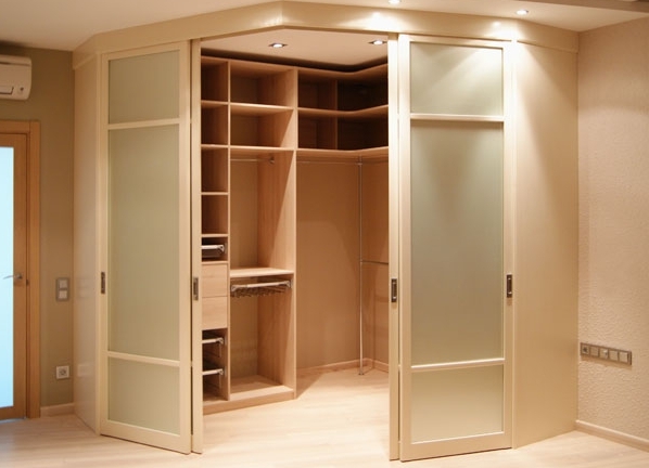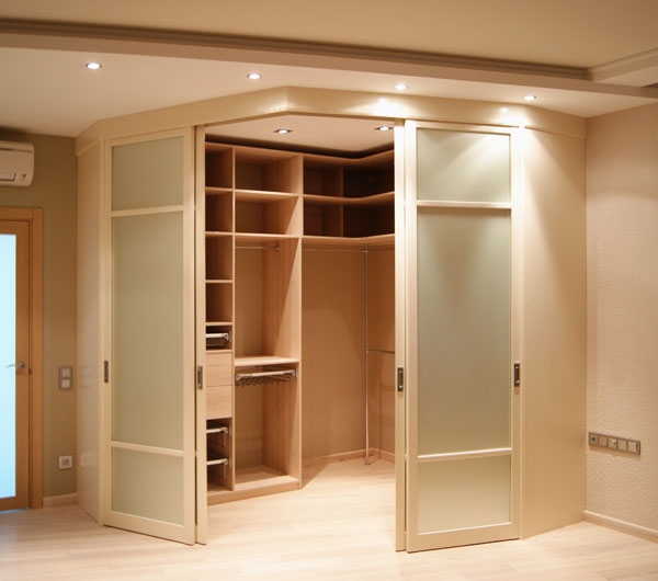 - angulairelorsque le coin de la pièce est séparé par une cloison ou des portes, et les systèmes de stockage sont placés le long de deux murs adjacents qui forment le coin. Une bonne option, mais pour obtenir un dressing dans lequel vous pouvez vous retourner, vous devez retirer une partie décente du coin de la pièce;