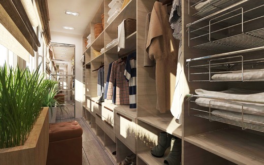 - garde-manger. Il n'y a aucun commentaire. Dans de nombreux appartements, le projet dispose d'une petite buanderie. Si à un moment donné vous ne vous en êtes pas débarrassé, il n'est pas difficile de le convertir en dressing. Garde-manger et le vestiaire dans leur fonctionnalité est très similaire, mais ne confondez pas leur objectif. Une salle de stockage est un endroit pour stocker des choses d'une nature complètement différente qui ne sont actuellement pas nécessaires ou qui sont rarement utilisées. Seuls les vêtements, chaussures et accessoires sont stockés dans le dressing, et le dressing assume idéalement la possibilité de changer de vêtements là-bas, cependant, dans un petit dressing, ce n'est pas toujours facile. Notez que dans les appartements modernes de petite taille, le garde-manger avec le dressing est souvent combiné - cela est autorisé, mais l'essentiel n'est pas de salir et de stocker des objets avec une odeur âcre à côté des vêtements;