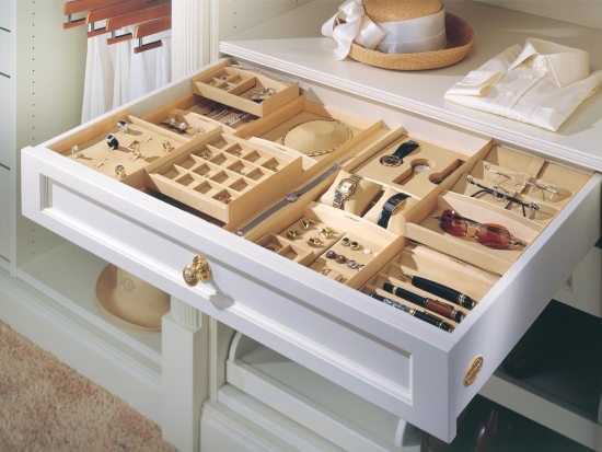 - chaque article dans le dressing devrait avoir sa propre place, sinon il y aura du chaos. Différent séparateurs d'étagère et les tiroirs aideront à ranger les petits articles comme les ceintures, les cravates et les bijoux aussi précisément que possible;