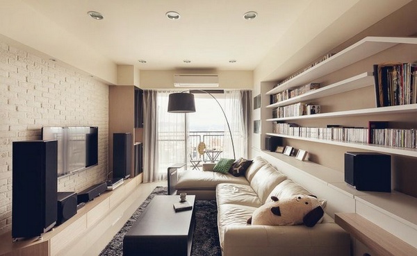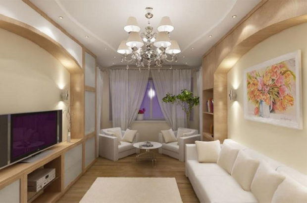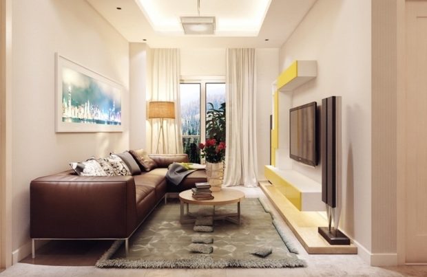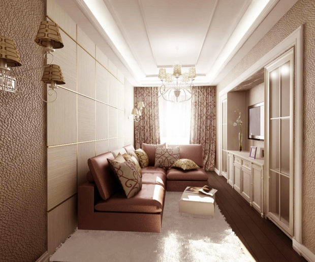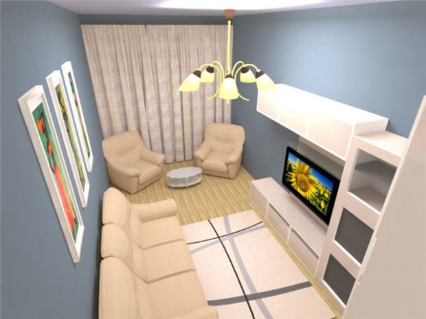 Sous le salon, ils allouent généralement la plus grande pièce de l'appartement, car il s'agit d'un lieu de rassemblement pour tous les ménages et invités. Si seule une longue pièce étroite est laissée à votre disposition, ce sera difficile. Ce sera doublement difficile si la pièce est de petite taille.