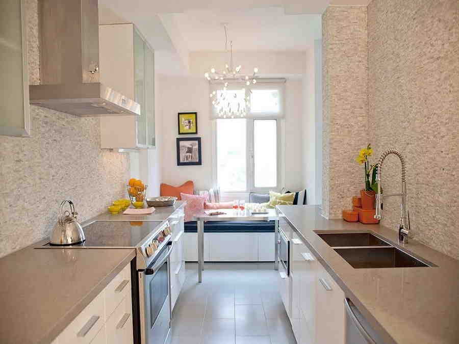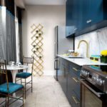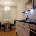 Sous la cuisine, vous ne pouvez donner qu'une partie d'un long mur. L'espace restant près du petit mur peut servir de salle à manger. C'est une assez bonne solution. Il est également conseillé d'utiliser des chaises translucides.