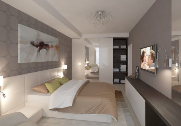Si la chambre est très allongée, vous pouvez en donner une partie pour créer dressing. L'espace restant sur le côté opposé peut être utilisé pour installer une table de travail ou une coiffeuse.