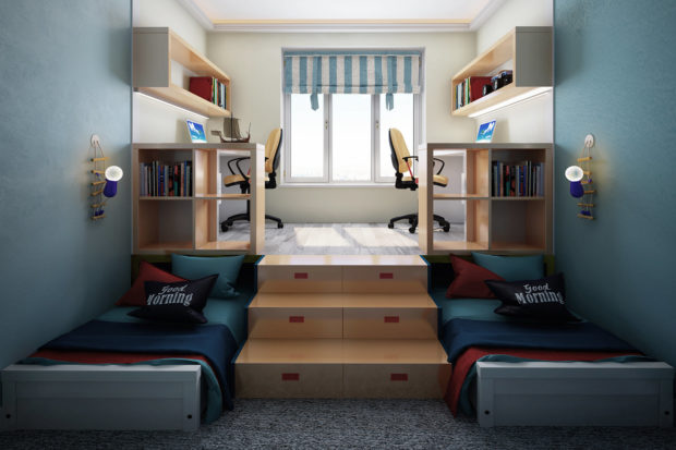- le podium peut être utilisé pour y placer un lit ou un lieu de travail. L'espace sous le podium peut être utilisé pour organiser le stockage. Il est important de choisir la hauteur optimale du "piédestal", afin que, en passant dessus, ne vous cogne pas la tête contre le plafond. Une séparation supplémentaire peut être obtenue en raison de la couleur différente des murs;