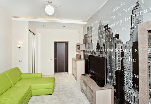 Un des longs murs peut être fini fond d'écran photo avec perspective. Paysages urbains et naturels adaptés. Cette solution peut être reconnue comme ingénieuse et universelle, car en raison de la perspective, la pièce se dilate considérablement et grâce à d'autres astuces, il est possible de transformer complètement la remorque en une pièce harmonieuse de la bonne forme.