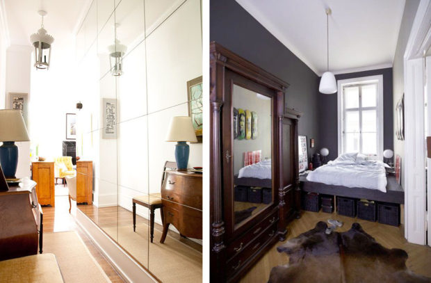 Corriger une pièce n'est pas mauvais miroirs. En raison de l'emplacement d'un grand miroir sur un long mur, l'effet d'agrandissement de l'espace peut également être obtenu. Il est important de ne pas en faire trop et de ne pas utiliser de peintures murales et un grand miroir dans une pièce. Une solution intéressante consiste à utiliser des inserts de miroir le long du bord supérieur ou inférieur du mur, ce qui rend les cloisons aérées et crée l'illusion que la pièce est en réalité beaucoup plus grande qu'elle ne l'est. De plus, les miroirs réfléchissent parfaitement la lumière, ce qui rend la pièce plus éclairée, ce qui dans notre cas est très important.
