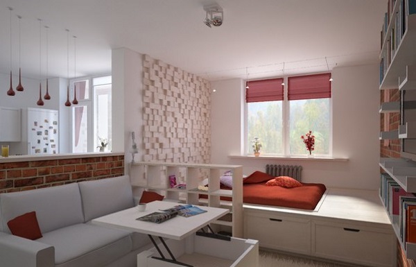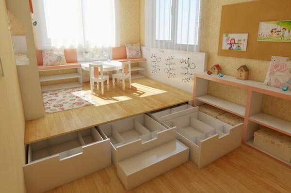 - utilisation rationnelle de la zone existante. Le podium vous permet de diviser une partie de la pièce en niveaux et d'utiliser chaque niveau à sa destination. Sur la colline, vous pouvez placer n'importe quel meuble, équiper bureau ou le salon, et l'espace sous le podium peut être utilisé pour stocker beaucoup de choses. Avec une bonne planification de la zone de stockage, vous pouvez remplacer seulement la moitié de l'énorme garde-robe, ce qui signifie qu'il y aura plus d'espace dans la pièce. Souvent, la place sous le piédestal est utilisée pour installer un rétractable les lits;