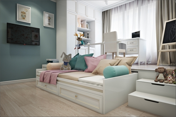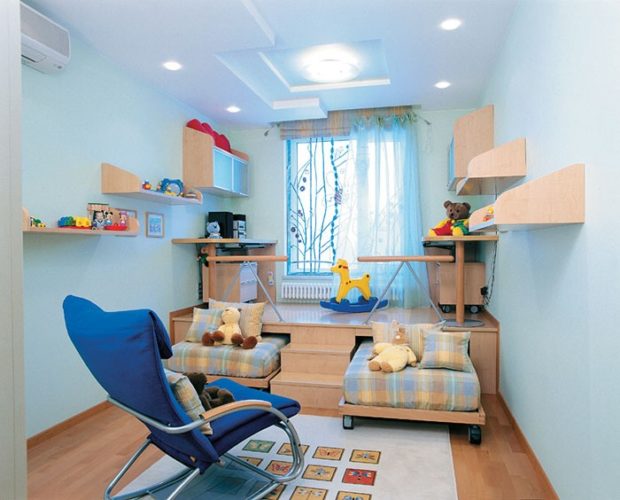 Le podium devient indispensable dans les studios et appartements 1 piècesurtout si la famille a des enfants. Dans ce cas, l'élévation peut devenir une chambre d'enfant miniature: au niveau supérieur, il y a tout ce qui est nécessaire pour étudier et se divertir, le niveau inférieur est un lit rétractable et les marches sont pour ranger les choses.