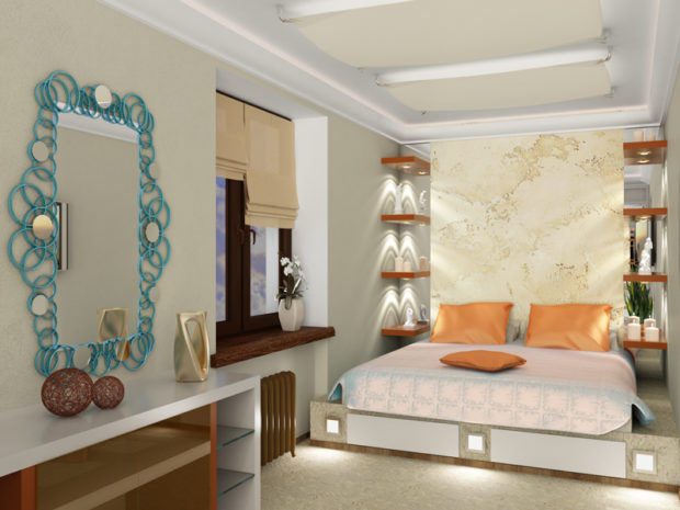 - lit de podium - la solution la plus courante. La zone de couchage peut être organisée dans une niche ou dans un espace ouvert - dans tous les cas, le podium vous permettra de le séparer visuellement des autres zones de l'appartement. La hauteur du podium pour le lit est de 20 à 50 cm, tenez compte de la hauteur du matelas lors du calcul. Lorsque vous disposez d'un lit sur une colline similaire, vous pouvez économiser sur l'achat d'un lit complet - vous n'avez besoin que d'un bon matelas. L'espace sous la couchette peut être utilisé pour le stockage. S'il reste de l'espace autour du périmètre du podium, il peut être utilisé table de chevet;