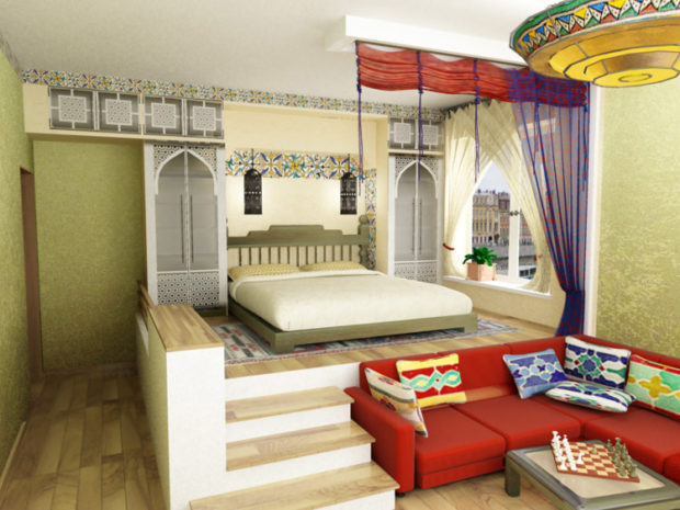 - correction d'espace. Le podium vous permet de fixer visuellement la géométrie chambres longues et étroites. Pour ce faire, il suffit d'organiser une élévation près d'un mur court, dont le contour aura une forme ronde ou courbe;