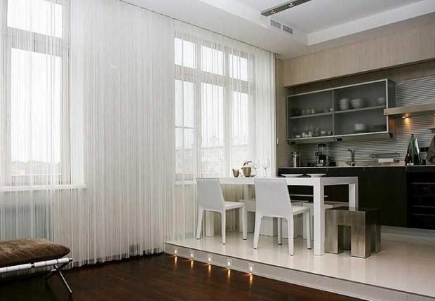 - zonage de l'espace, car la différence de hauteur vous permet de séparer clairement un domaine fonctionnel d'un autre. Pertinent pour studios et salons combinés avec cuisines;