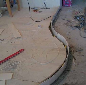 - si l'extrémité du podium doit être incurvée, un matériau souple est utilisé pour sa doublure. Le contreplaqué mince et les profils métalliques conviennent.
