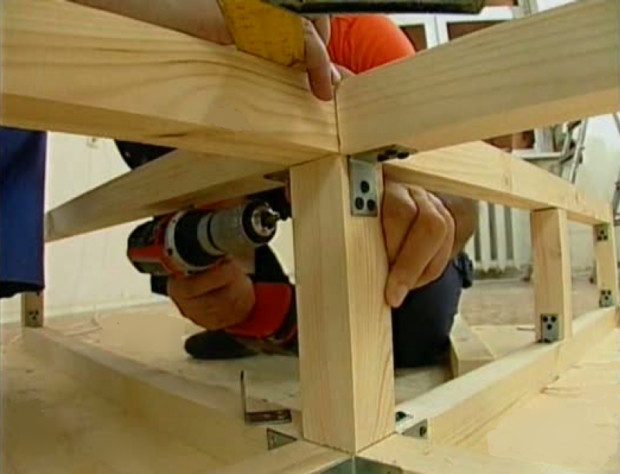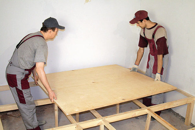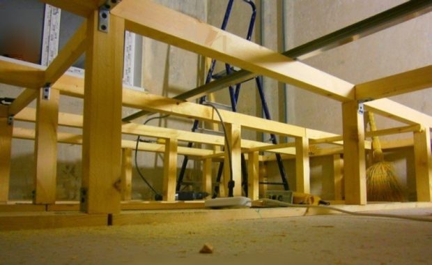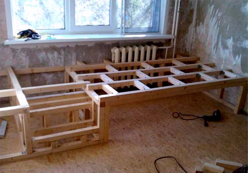 Wireframe les podiums sont la meilleure solution pour les appartements ordinaires. Le cadre est en bois ou en métal, pour le contreplaqué, contreplaqué, aggloméré ou OSB. Les matériaux en feuille peuvent être posés en deux couches pour augmenter la résistance structurelle.