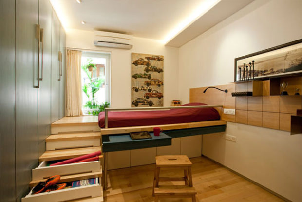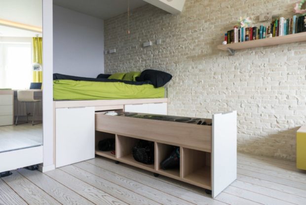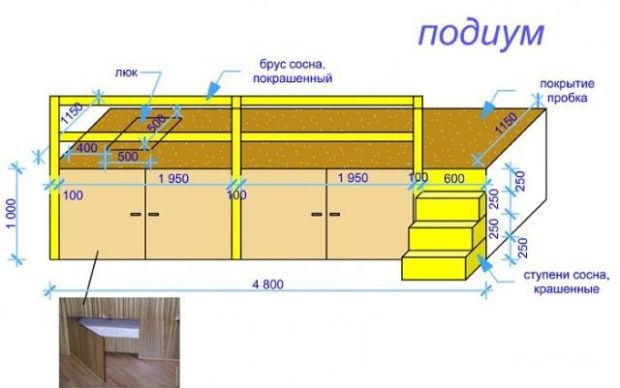 - très soigneusement la peine de calculer la hauteur du podium. Si vous souhaitez placer un lit pliant à l'intérieur, il convient de considérer la hauteur du mécanisme avec des rouleaux et des guides, l'épaisseur du matelas, des oreillers et des couvertures. En moyenne, la hauteur du podium dans ce cas devrait être de 70 à 80 cm Si la hauteur des plafonds de l'appartement est de 2,5 m, ce n'est pas votre option;