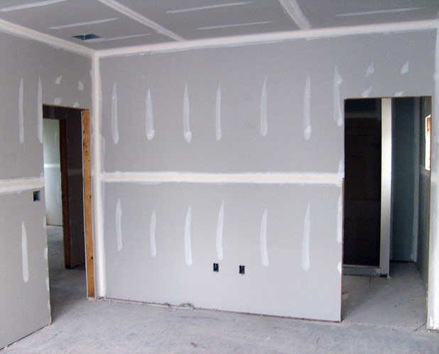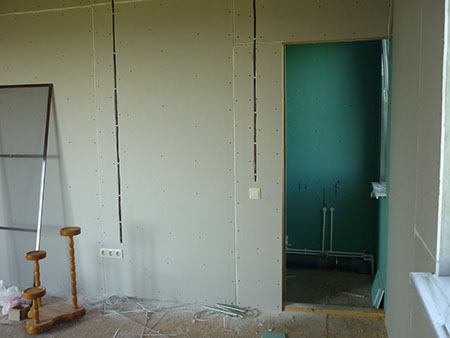 - cloison sèche. Il s'agit de l'option la plus populaire. Il existe plusieurs façons de le monter sur les murs, tout dépend des objectifs. La première méthode est installation de cloisons sèches directement sur le mur avec l'aide vis et sans cadre. Ainsi, l'isolation acoustique et la résistance au feu sont augmentées, et la fragilité des cloisons sèches est également annulée. Moins - le câblage devra être posé voie ouverte, et beaucoup pensent que cela est inesthétique. La deuxième option est monter une cloison sèche en deux couches: dans le premier, les stroboscopes sont faits pour le câblage et les câbles sont posés, et la deuxième couche est utilisée pour le nivellement. Dans ce cas, il est possible d'obtenir le résultat le plus esthétique, et la résistance au feu de la structure augmente considérablement - les murs peuvent résister au feu pendant 1,5 heure. Une autre option est monter les cloisons sèches sur un cadre en métal ou en bois. Tous les fils, ainsi que les conduits d'air et certains tuyaux peuvent être cachés derrière les cloisons sèches. Certes, pour cela, vous devez sacrifier l'espace utilisable. Après l'installation des cloisons sèches, toutes les coutures et l'emplacement des vis sont du mastic, après quoi vous pouvez procéder à la finition;