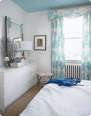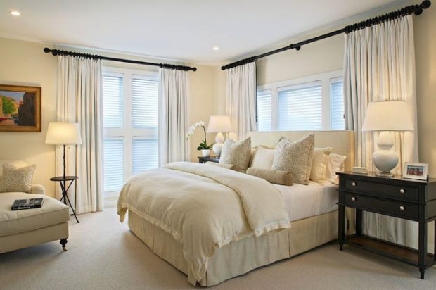 - tringle à rideau est préférable d'être situé sous le plafondet le tissu du rideau doit atteindre le sol. De beaux plis verticaux de tissu léger augmenteront la hauteur du plafond;
