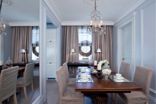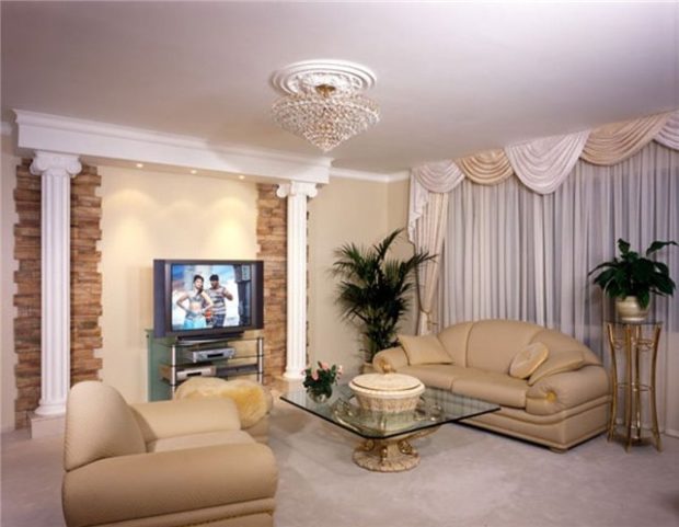 - Vous pouvez équiper de grands éléments architecturaux tels que colonnes. Je voudrais considérer de longs détails verticaux, le regard glisse du sol au plafond, et notre cerveau perçoit la hauteur de la pièce un peu plus grande qu'elle ne l'est en réalité;