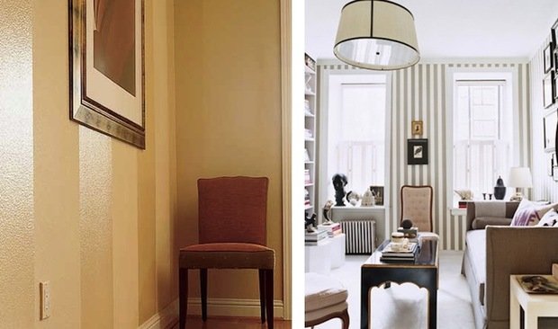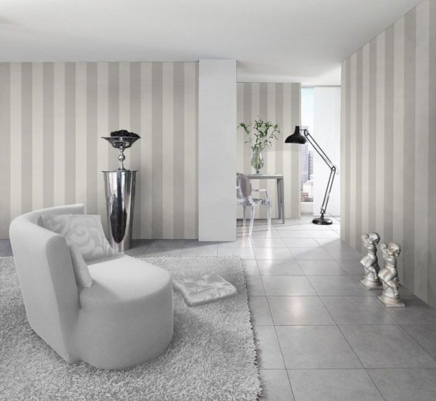 - bande verticale - Une autre façon gagnant-gagnant de relever le plafond. Il vaut mieux que les bandes soient larges et combinent des couleurs pas trop contrastées. Un seul mur, l'accent, est transformé en bande, sinon il ondulera fortement dans les yeux. Au lieu des rayures habituelles, vous pouvez utiliser un ornement de troncs d'arbre ou de losanges. Les rayures verticales peuvent être dessinées sur un mur peint, vous pouvez utiliser du papier peint avec un motif approprié. Les bandes peuvent monter jusqu'au plafond. Fonctionne également bien panneaux en bois naturel;