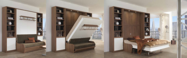 Il est clair que tous les appartements ne peuvent pas accueillir un grand lit fixe. Doit souvent être content canapé pliant comme un endroit pour dormir, mais il existe des alternatives. Ce sont les soi-disant lits transformables ou lits de garde-robe. Pendant la journée, ils sont maintenus près du mur et n'interfèrent pas avec la libre circulation, et la nuit, grâce au mécanisme de pliage, ils se transforment en dormeur complet. Pendant la journée, un tel lit peut servir de faux garde-robe, être décoré d'une jolie photo ou même se transformer en un petit canapé.
