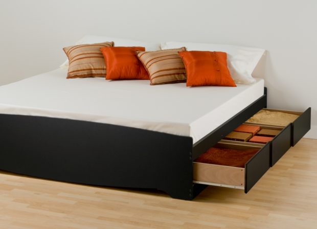 Sous un grand lit double, il y a autant d'espace que la moyenne garde-robe ou garde-manger compact. Si l'appartement est petit, il est idiot de ne pas utiliser cet espace. Bien sûr, vous pouvez prendre le modèle, où se trouve sous la couchette plusieurs tiroirs, mais cette approche ne permet pas d'utiliser au maximum l'espace de chevet. Il ne sera pas possible d'ouvrir de tels tiroirs dans n'importe quelle chambre, et trouver une telle option n'est pas si facile.