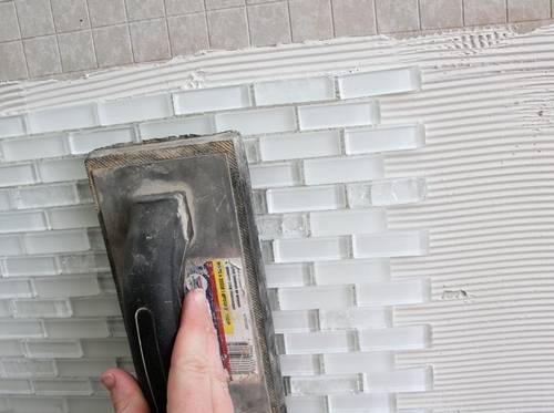 Habituellement pour monter tous types de carreaux de céramique, granit et pierre artificielle utiliser colle grise. En matière de verre mosaïquemieux prendre la composition couleur blanche. Il ne s'agit pas d'adhérence (cela ne dépend pas de la couleur, contrairement aux mythes existants) - il s'agit d'esthétique, qui sera beaucoup plus élevée lors de l'utilisation de colle blanche.