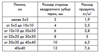 - taille de tuile. Plus chaque élément de tuile est petit, plus une couche de colle est fine pour le fixer. Ainsi, par exemple, pour le montage de carreaux avec un format de 2 * 2 à 10 * 10 cm, la consommation moyenne sera d'environ 3 kg / m2. Pour les carreaux de 10 * 15 à 20 * 20 cm, la couche adhésive augmente et la consommation peut atteindre 4 kg / m2. Sur une tuile de 20 * 30 à 30 * 30 cm, il est nécessaire d'appliquer une couche de colle encore plus épaisse, et la consommation sera d'environ 5 kg / m2. Pour l'installation de carreaux de plus de 30 * 30 cm, 6 kg de mélange sec pour chaque m2 surface;