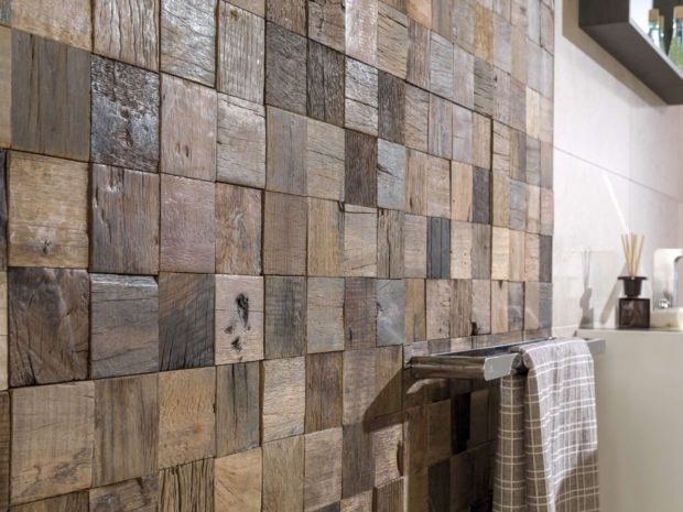 Une autre nouveauté du marché moderne des matériaux de finition. Les éléments de la mosaïque sont faits de bois précieux, ils peuvent avoir n'importe quelle forme et l'effet décoratif est obtenu grâce à une combinaison de carreaux de différentes couleurs et textures. Un tel matériau, comme l'arbre entier, a peur de l'humidité, du feu, des parasites et nécessite des soins spécifiques.