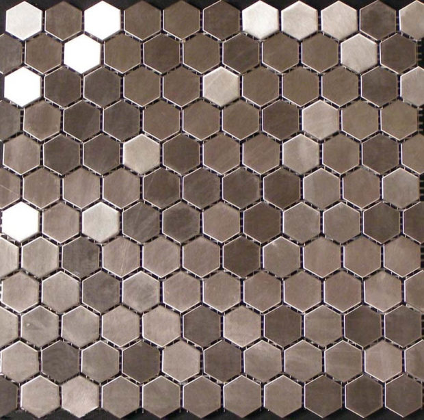 On remarque tout de suite, c'est une option pour un amateur. Une mosaïque métallique est apparue relativement récemment, elle est principalement constituée de acier et laiton. Les éléments métalliques sont montés sur une base en caoutchouc ou en caoutchouc, qui conserve la flexibilité nécessaire. La forme des éléments peut être absolument quelconque: des triangles et des hexagones aux formes géométriques irrégulières. La surface peut être polie ou mate, avoir des encoches. Des finitions similaires sont utilisées dans intérieurs dans les styles salut-technologie et loft.