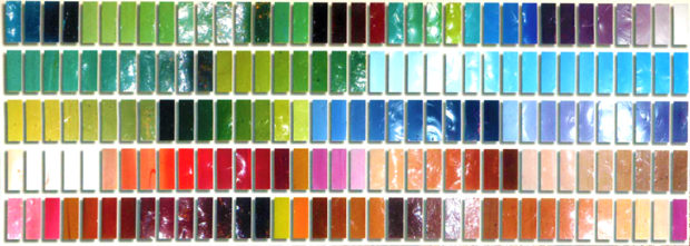 Une mosaïque smalt est obtenue en pressant et en frittant des particules de verre coloré avec l'ajout de colorants. Le résultat est un matériau opaque de couleur dense avec propriétés uniques: