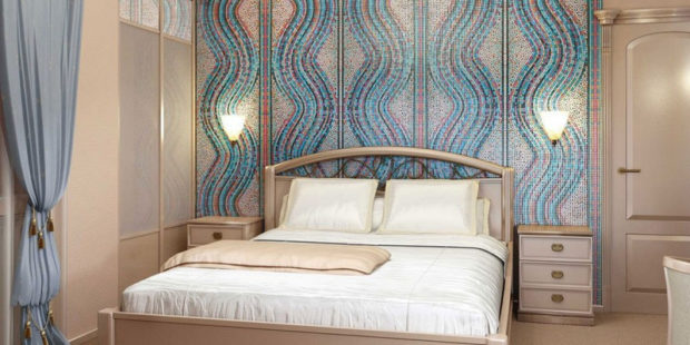 - sur l'un des murs, vous pouvez disposer une image entière ou un ornement en mosaïque. Il peut s'agir d'une sorte de paysage, d'une abstraction géométrique ou simplement d'un panneau multicolore;